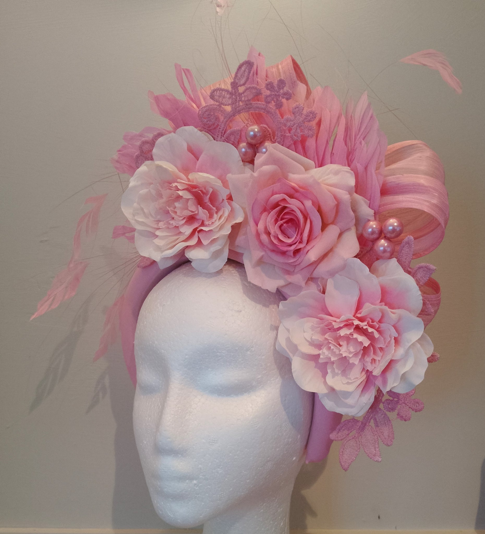 This pretty fascinator features a lovely pale pink padded headband which has been embellished with gorgeous flowers, floating feathers, lace and silk loops. There is also a flower at the back so it looks great from all angles.